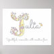 Arte de monograma / inicial J personalizado perfecto para el dormitorio o la sala de juegos de una niña en tonos de gris, blanco, amarillo, rosa y púrpura. Personalice con el nombre de su hijo que comience con J, y el significado del nombre para un toque verdaderamente personalizado en el dormitorio o la guardería de su hijo, este ejemplo es para el nombre Julia Joven, romántico con estilo creativo. Impresión de cartel lindo ideal para un nuevo bebé, regalo de bautizo o baby shower. © Diseño de arte gráfico y descripción de dibujo de monograma de J corazones y flores únicas por Sarah Trett. www.sarahtrett.com para www.mylittleeden.com