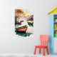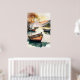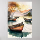 Poster de serenos lanchas flotando en un tranquilo lago rodeado de montañas y árboles, con un cielo cálido y dorado iluminando la escena. Las tranquilas aguas reflejan los barcos y los suaves colores de la puesta de sol.
