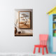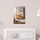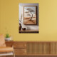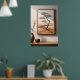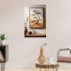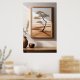 Poster de un árbol solitario sobre un paisaje sereno de color beige y marrón colgado en la pared. La sala también cuenta con una mesa de madera adornada con un jarrón de cerámica y un tazón más pequeño. Se filtra la luz solar y se proyectan sombras sutiles a través de la escena.
