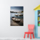 Poster de cuatro botes de madera flotando cerca de la orilla de un cuerpo tranquilo de agua bajo un cielo ligeramente nublado. Al fondo se ven grandes rocas y algunas pequeñas estructuras.