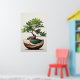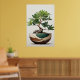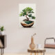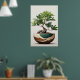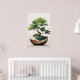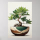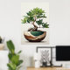 El arte Wabi-Sabi de un árbol de bonsai en maceta con hojas verdes vibrantes y un tronco retorcido se representa con un alto nivel de detalle. La olla presenta un diseño giratorio y multicolor que complementa la forma orgánica del árbol.