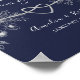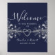 Elegante póster de bienvenida de boda azul marino moderno con corazón de cuerda plateada simple y encaje floral dorado.