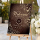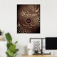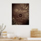 Bienvenidos a su boda campestre vintage con nuestro elegante póster de bienvenida de madera rústica. Adornado con intrincado encaje floral dorado boho y personalizado con el monograma de la novia y el novio, establece el tono para una encantadora celebración en medio de la belleza de la naturaleza.