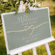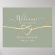 Póster de bienvenida de boda verde salvia elegante, moderno y minimalista con corazón de cuerda dorada y letra manuscrita simple.