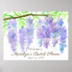 Un póster de despedida de soltera que presenta una rama de glicina en plena floración con flores en cascada en tonos de suave violeta pintado con acuarela acentuado con manchas de salpicaduras en el fondo. Puedes editar el texto para adaptarlo a tus necesidades. En el Lenguaje de las Flores, la glicina significa bienvenida. Encuentra este diseño en mi tienda en invitaciones, pegatinas y más.
