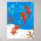 Una ilustración gráfica acuática de un lindo caballito de mar y una divertida estrella de mar en un cartel. ©2013charmainepaulson