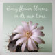 Póster de frase inspiradora. Póster de cada flor florece en su propio tiempo. Póster de cita motivacional decorado con una imagen de un cactus con una hermosa flor de color rosa pálido a blanco en plena floración.
