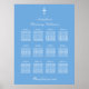 Póster de cartel de asientos de bautizo de mesa 12 azul, por favor personalice el nombre de la persona que se bautiza y los nombres de los invitados junto con cualquier otro texto que desee personalizar. Un cartel de asientos elegante con una cruz blanca y texto blanco elegante sobre un hermoso fondo azul suave.