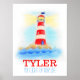 Póster de arte de faro de acuarela para niños. Ideal para el cuarto de un futuro capitán de mar o para habitaciones con tema náutico. Personalice este artículo con el nombre de su hijo (hasta 7 letras) y un mensaje de su elección. Este ejemplo dice: TYLER Iluminas nuestra vida. Una excelente idea de regalo para nuevos bebés y para fiestas de bebé niño. Pintado de manera única en acuarela y diseñado por Sarah Trett.