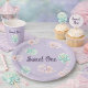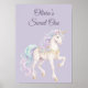 Elegante póster de cumpleaños dulce uno en un suave estilo de cuento de hadas pastel con un soñador fondo lila y caprichosa ilustración de unicornio. Perfecto para la fiesta de cumpleaños de una niña, decoración mágica para guardar, arte mural inspirado en la guardería o celebración de cumpleaños pastel.