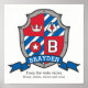 Póster de monograma de escudo estilo caballeros con la letra B, arte y nombre perfecto para el dormitorio o sala de juegos de un niño en tonos rojos, azul, blanco y gris. Personalice con el nombre de su hijo y el significado del nombre para un toque personalizado en el dormitorio o guardería de su hijo, este ejemplo es para el nombre Brayden "Del amplio valle". Amplio, valiente, inteligente y sabio. Impresión de póster ideal como regalo para un bebé recién nacido, para un bautizo, nombre de bebé o regalo para baby shower. Dibujo de escudo único, arte gráfico, investigación de nombres, redacción y diseño de Sarah Trett. www.sarahtrett.com para www.mylittleeden.com