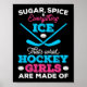 Poster de temas de hockey para el chica de hockey con un disco de hockey y palos con texto de color blanco, rosa y azul que dice Azúcar, especias y todo el hielo que es de lo que se hacen los Chicas de hockey.