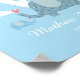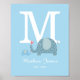 Un encantador póster de guardería con monograma inicial, que incluye el nombre de tu bebé y el año en que llegó con adorables elefantes padre y bebé con lunares sobre un suave fondo azul. ¡Un bonito recuerdo para atesorar!
