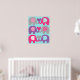 El póster de guardería de amor de elefante presenta seis elefantes en gris, rosa y púrpura con orejas estampadas sobre un fondo azul turquesa con lunares.