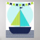 Un póster de guardería con diseño de barco de vela náutico ideal para la habitación del bebé o de un niño mayor, que presenta un barco de vela con velas verdes y azul turquesa, un estandarte de bandera verde lima y azul marino, y agua con rayas de chevron.