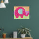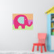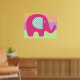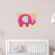 Un colorido póster de guardería presenta un elefante rosa brillante con orejas punteadas de azul y blanco y un fondo con puntos naranja, lavanda y verde.