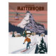 Poster de la estación de esquí de Matterhorn, retro. Tarjeta de viaje Alpes Winter, esquiador bajando por la ladera, vistas a la añada del pueblo de montaña