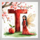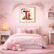 This delightful watercolor letter T poster celebrates nature's bounty with a beautiful ripe peach, bringing orchard charm and cultural symbolism to children's spaces. The bold letter T is rendered in rich red watercolor with elegant gold trim, featuring the characteristic horizontal top and vertical stroke with gorgeous tonal variations from deep burgundy to bright coral creating dimensional depth. The strong geometric form of the T creates visual stability while the watercolor technique adds organic warmth with subtle pooling and color variations.