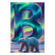 Llena tu espacio con la belleza radiante del cielo ártico con este póster de la letra Aurora B. Una luminosa letra B se eleva sobre un claro de un bosque nevado, iluminado por cintas arremolinadas de luces del norte turquesa, violeta y esmeralda. El cielo irradia con un color brillante, proyectando suaves reflejos a través de la nieve y resaltando al tranquilo oso polar que está cerca de la base del monograma.