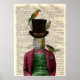 Página de diccionario de época con la impresión de un conejo vintage con un traje colorido. El ilustracion animal vintage también tiene aves de época coloridas. El fondo es una página original del diccionario antiguo.