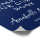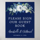 Audaz azul marino y blanco diseño floral de peonía para una boda de invierno moderna. Un elegante spray botánico de hojas verdes se despliega sobre una escritura blanca manuscrita de moda para un letrero de evento moderno para su libro de invitados.