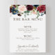 complemente su evento de boda rústica con este menú de bar de boda de flores clásicas elegantes. El diseño presenta hermosas flores pintadas a mano en rosa, rubor, azul, azul marino y burdeos con hojas verdes, agrupadas cuidadosamente en ramos elegantes para adornar las tarjetas de invitación de su evento.