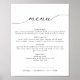 Esta señal de menú de boda imprimible presenta una fuente de caligrafía elegante y un diseño minimalista moderno con texto totalmente editable. Cambie fácilmente las fuentes, los colores de las fuentes y el color de fondo para que coincida con el estilo de su evento. La simple combinación de colores en negro y blanco lo hace la adición perfecta para cualquier evento. Utilice este cartel para su recepción de boda, ducha de novia, ducha de parejas, etc.