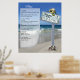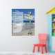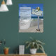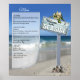 Boda de verano en la playa con rosas floribundas blancas sobre el arco mientras caminas por una alfombra de arena con olas rompiendo en el fondo para inspirar una paleta que establezca el escenario para un look chic y glamuroso para personalizar el póster del menú