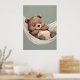 Tan acogedor como puede ser. Este póster tranquilo presenta un adorable oso durmiendo acurrucado en una hamaca, rodeado de tonos suaves de salvia y sombreado dulce y suave. Perfecto para guarderías, habitaciones de niños o cualquier lugar que necesite un poco de calma.