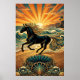 Captura la energía cruda de la costa con este impresionante semental Art Deco. Un poderoso caballo negro con una melena dorada fluyente galopa a través de olas estilizadas bajo un sol masivo y radiante. El primer plano presenta conchas geométricas intrincadas y patrones de olas, fusionando el poder ecuestre con el lujo de la década de 1920.