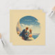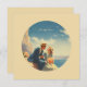 Poster de viaje de una pareja romántica cerca del mar. Flores suaves de color rosa en primer plano y un hermoso cielo azul claro en la parte posterior,