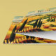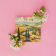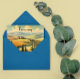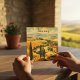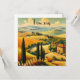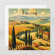 poster de viajes vintage del campo en la Toscana Italia con cipreses, colinas doradas onduladas y casas remotas