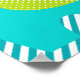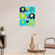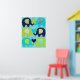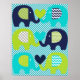 El póster de vivero de amor de elefante presenta seis elefantes en azul marino, azul cian y verde lima con franja de chevron impresa, flores y orejas punteadas en un fondo de franja diagonal azul y blanca.