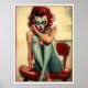 This whimsical 1940's zombie pin-up model strikes a captivating pose, her glowing eyes creating an irresistible undead charm. With torn clothing and hints of decay, she still exudes playful confidence—blending retro glamour with a delightfully ghoulish twist.
