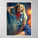 This whimsical 1940's zombie pin-up model strikes a captivating pose, her glowing eyes creating an irresistible undead charm. With torn clothing and hints of decay, she still exudes playful confidence—blending retro glamour with a delightfully ghoulish twist.