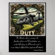 Un helicóptero militar, su forma gris un símbolo de fuerza y preparación, vuela sobre un paisaje verde de colinas onduladas y cielos despejados. Las aspas del rotor del helicóptero están en constante movimiento, una mancha borrosa contra el fondo pacífico. La imagen está enmarcada por un borde dorado decorativo con patrones florales sobre un fondo negro. En la parte superior, la palabra "Deber" está escrita en elegante letra dorada y negrita. "Las libertades de nuestro país, la libertad de nuestra Constitución civil, valen la pena defenderlas a toda costa; y es nuestro deber defenderlas contra todos los ataques". -Samuel Adams