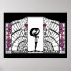 Esta fabulosa composición es una interesante mirada a un clásico del arte deco - una belleza bañadora con una sombrilla en silueta. Está flanqueada en ambos lados con abanicos y pequeños remolinos con flores de estilo deco en los márgenes izquierdo y derecho. Rodeado de negro con fondo blanco, acentuado con flores en rosa y morado.