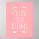 Este póster inspirador con la cita "Sigue tus sueños" presenta tipografía blanca y una flecha dibujada a mano sobre rosa suave.
