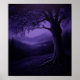 This whimsigoth poster features a serene night landscape featuring a large tree with exposed roots in the foreground, misty hills, and silhouetted pine trees under a deep purple sky, evoking calm and mystery. Finished as an oil paint art print.
