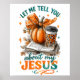 Diseño pacífico y colorido con una escena otoño/otoño con un libro abierto, calabaza y café. El colorido texto inspirador dice: "Déjenme contarles acerca de mi Jesús". Este diseño está disponible en una amplia variedad de productos.