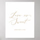 Este delicado letrero de boda de amor dorado dulce es perfecto para una boda moderna. El diseño minimalista romántico presenta una tipografía amarilla dorada champán encantadora y elegante sobre un fondo blanco con un aspecto limpio y simple. ¡Personalice el texto para que diga lo que quiera!