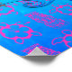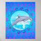 Delfín saltando a través de un símbolo maorí con un océano azul y una velera detrás. Tortugas rosas honu y máscaras de tiki rosa sobre un fondo azul marino.