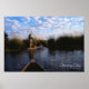Las fotos y regalos de la naturaleza del Delta del Okavango muestran una hermosa fotografía de un viaje en un mokoro, una canoa excavada, en el Delta del Okavango en Botsuana África, tomada por Kurt Keller con una cámara de 35 mm mientras estaba en un safari africano en Botsuana. Un hombre de la barra se para en el mokoro frente al paso propulsándolo a través de las aguas poco profundas del delta parándose en la popa y empujando con un asta. Esto se tomó en 2000, el primer año después de 10 años de sequía. El campamento en el que nos quedamos había estado dando excursiones en jeep hace años en el mismo lugar en el que ahora estamos en botes. El delta del Okavango, o pantano de Okavango, es el delta interior más grande del mundo. Se forma donde el río Okavango se vacía en un pantano en una cuenca del desierto de Kalahari, donde la mayor parte del agua se pierde por evaporación y transpiración en lugar de drenar en el mar.
