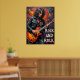 Este cuadro es un retrato atrevido y texturizado de un músico de rock con chaqueta de denim y jeans, intensamente enfocado en tocar una guitarra eléctrica. La obra de arte tiene un estilo de deterioro pesado, con gruesos y enérgicos pinceles que le dan a la pieza un aire dinámico y crudo. El fondo es una mezcla abstracta de rojo, púrpura y negro con la palabra "ROCK" destacada, destacando el tema musical.