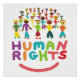 El diseño de Derechos Humanos muestra una variedad de personas celebrando la humanidad, amistad e igualdad, con un gran eslogan de "Derechos Humanos" debajo. Un mensaje claro de apoyo a un mundo justo.