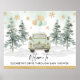 ¡Pite, bocine, grite y agite! Letrero de bienvenida único para conducir a través con elegantes árboles de pino de acuarela, paisaje nevado y un automóvil vintage chic