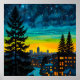 Una escena nocturna fascinante con un brillante horizonte urbano bajo un cielo cósmico lleno de estrellas. Las ventanas doradas contrastan maravillosamente con los azules y verdes de la noche. Una sinuosa carretera y unos pinos imponentes le dan profundidad a este tranquilo paisaje urbano.