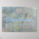 En un texto azul sobre un fondo de naturaleza digital en capas en tonos neutros, el mensaje inspirador en este poster advierte, "Lenta hacia abajo: ¿Realmente quieres llegar a la línea de meta más rápido?"