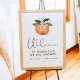 Esta señal de bienvenida para la despedida de soltera presenta una naranja mandarina clementina de acuarela con flores blancas de acuarela lindas y una fuente de escritura divertida. Esta señal de bienvenida es perfecta para su despedida de soltera o desayuno de novia con tema de cítricos o se puede utilizar para cualquier otro evento inspirado en frutas tropicales.