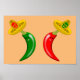 Este impresionante poster cuenta con un par de ajíes, un chile rojo y un chile verde. Ambos tienen ojos negros y bocas rosas. Cada chile lleva un gorra con sombrero que tiene un cráneo de color opuesto al ají en celebración del Día de los Muertos en México, Día de los Muertos. El sombrero también contiene tres flores con pétalos rojos y verdes alternados que representan la bandera de México.
